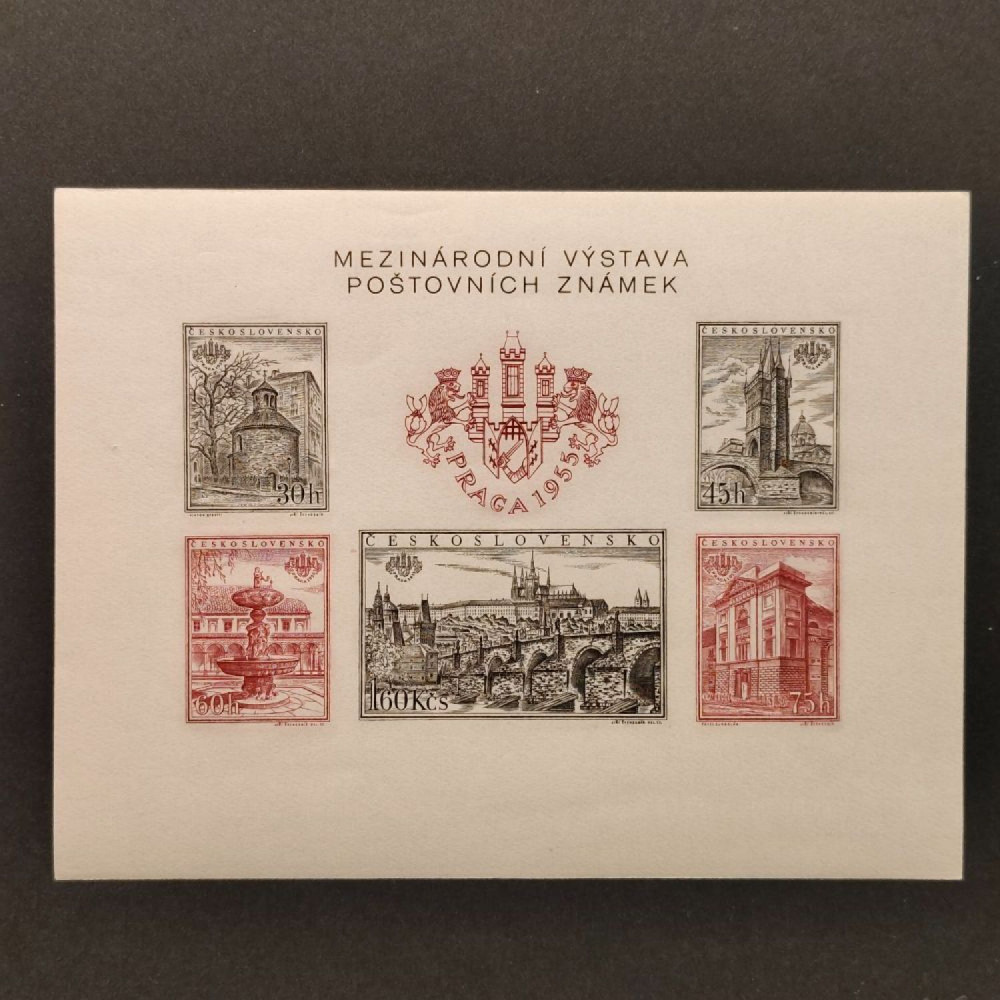 Položka:Aršík ČSR, Pof.A853/857B** Mezinárodní výstava poštovní známke PRAGA 1955 - aršík nezoubkovanýKatalogPofisA853/857BNepoužitá, neražená, čistá známka/položka.