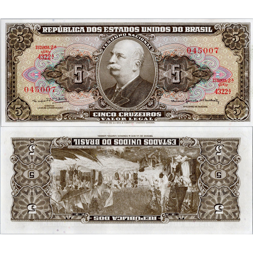 Položka:Bankovka Brazílie, serie A, 5 Cruzeiro, Pi. 176d, N/UNC, Brazilská pěticruzeirosová bankovka s portrétem Barãa do Rio Branco uprostřed a ornamentálním rámečkem., 5 CruzeiroBankovkaDetailVydavatelTesouro NacionalSérieEstampa 2ASériové číslo4322SpecimenNoZnehodnocenáNoOboustraně bezvadná, dosud neobíhající bankovka.