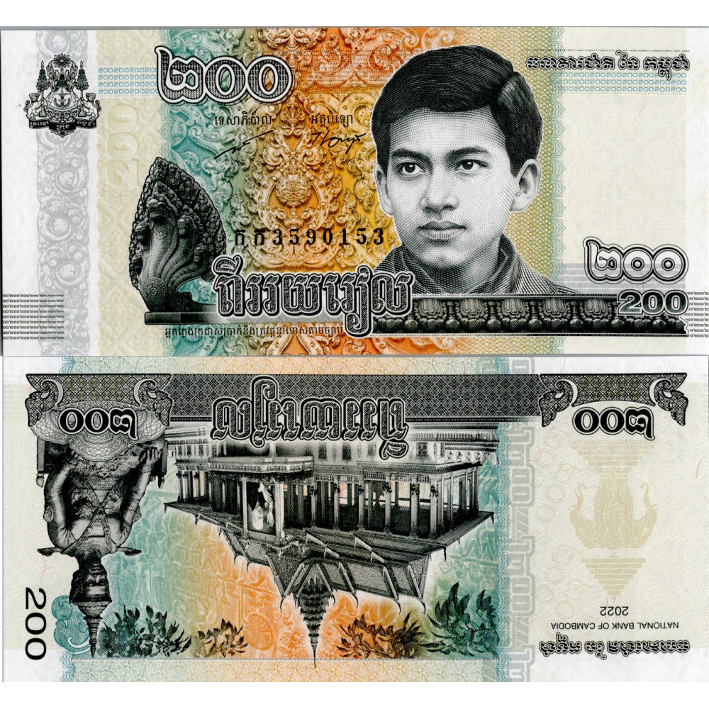 Položka:Bankovka Kambodža, 2022, serie កក, 200 Riel, Pi. 65Aa, N/UNC, Kambodžská bankovka 200 Riel se zobrazením portrétu krále Norodoma Sihamoniho jako mladíka a nágovské sochy z Angkoru na lícové straně a budovy Národní banky Kambodže s královskou sochou na rubové straně., 200 RielBankovkaDetailVydavatelធនាគារជាតិនៃកម្ពុជាRok2022Sériové číslo3590153SpecimenNoZnehodnocenáNoOboustraně bezvadná, dosud neobíhající bankovka.