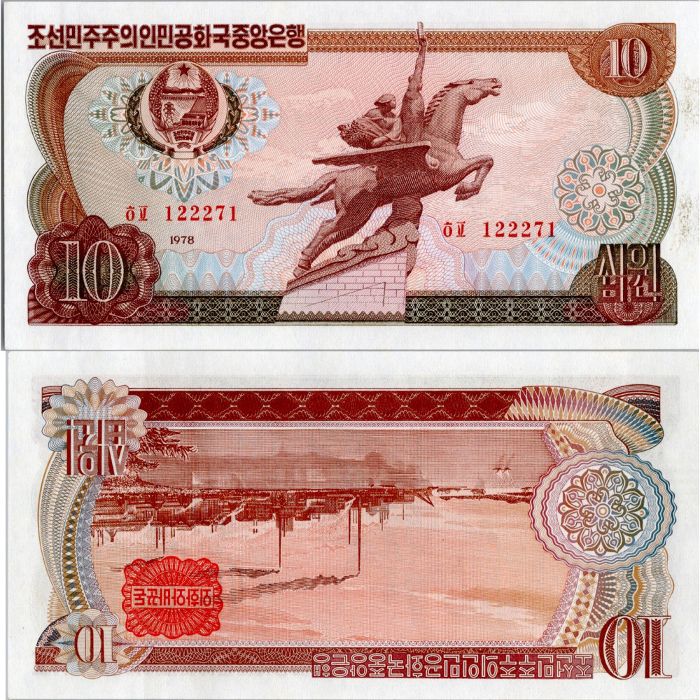 Bankovka KLDR, 1978, 10 North Korean won, Pi. 20c, N/UNC, Bankovka 10 wonů Severní Koreje z roku 1978 s motivem sochy Čchollima a státního znaku., 10 North Korean won