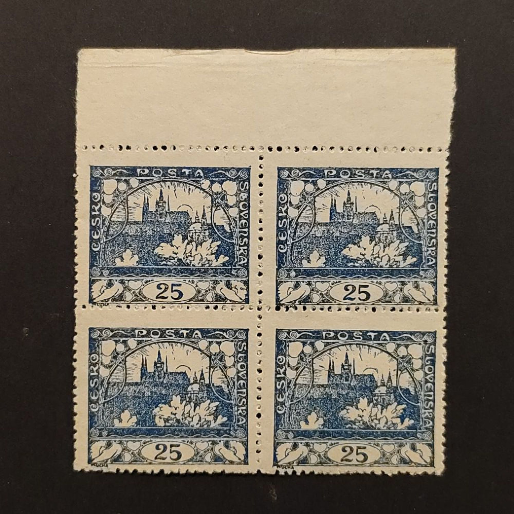 Položka:Čtyřblok ČSR, Pof.10A**, 25h Hradčany, modrá, 25hKatalogMichel5DPofis10ANepoužitá, neražená, čistá známka/položka.