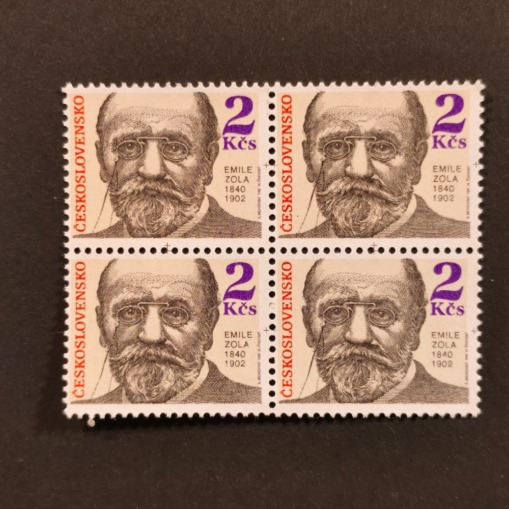 Položka:Čtyřblok ČSR, Pof.2925**, 2 Kčs, 1990 - Osobnosti výročí 1990, 150. výročí narození Emila Zoly (1840–1902), 2 KčsKatalogMichel3033Pofis2925Stanley Gibbons30082774Yvert2834Nepoužitá, neražená, čistá známka/položka.