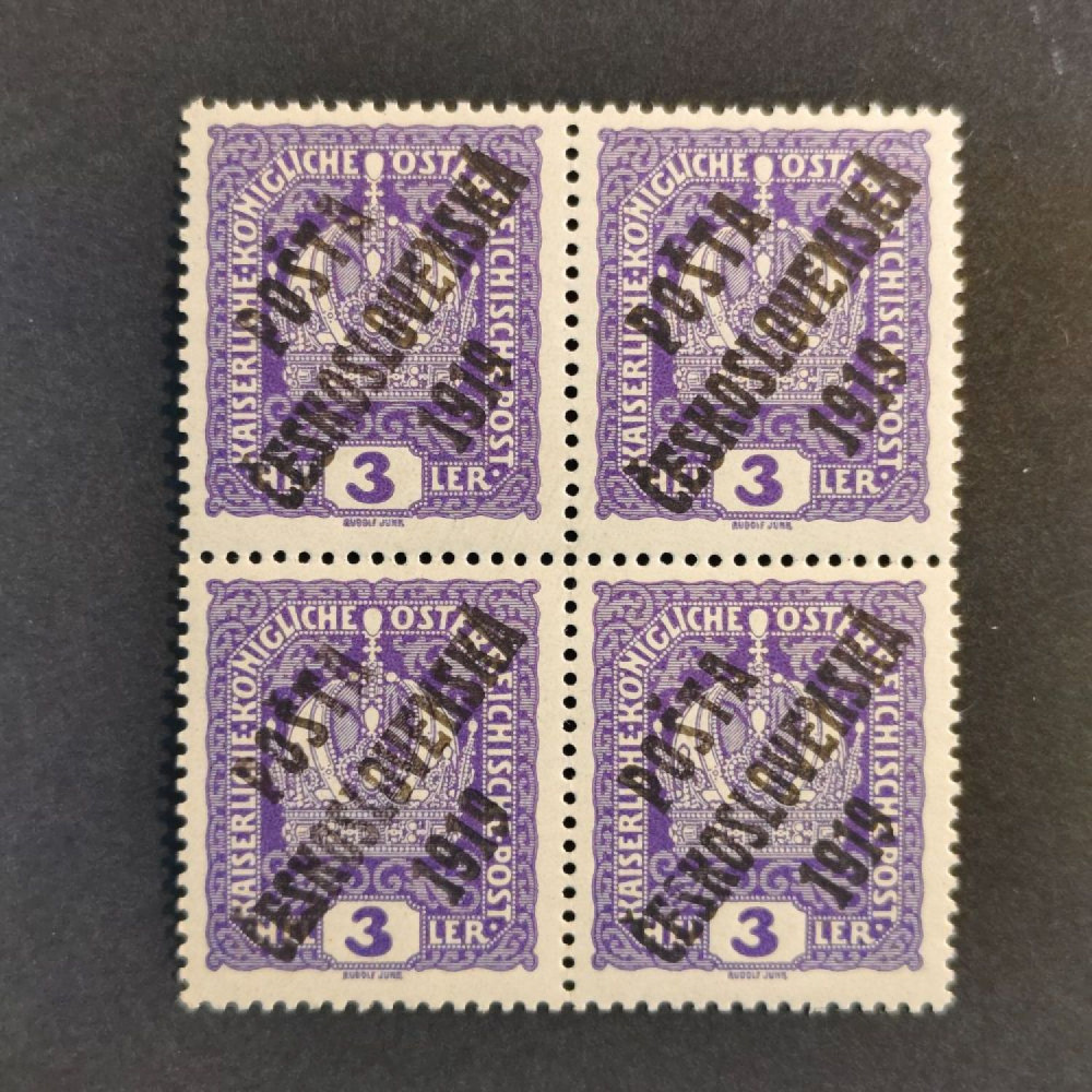 | Položka: | Čtyřblok ČSR, Pof.33**, ST typy přetisků, 3h Přetisk PČ 1919 – výplatní známky malého formátu z let 1916-1918, 3hKatalogPofis33Nepoužitá, neražená, čistá známka/položka. |