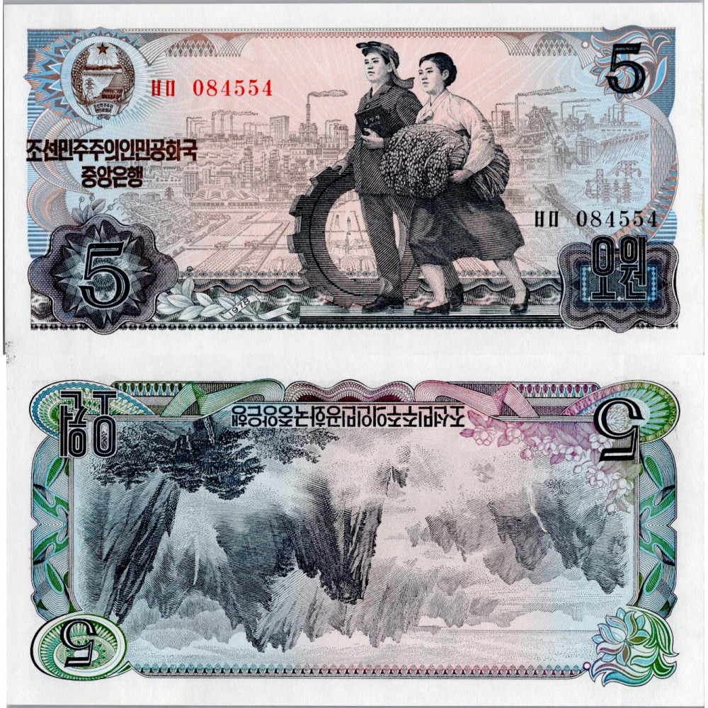 Bankovka KLDR, 1978, serie ㅂㅈ, 5 won, Pi. 19a, N/UNC, Bankovka 5 wonů ze Severní Koreje z roku 1978 s vyobrazením dělníka a rolnice před továrním komplexem; na rubu hora Paektu., 5 won