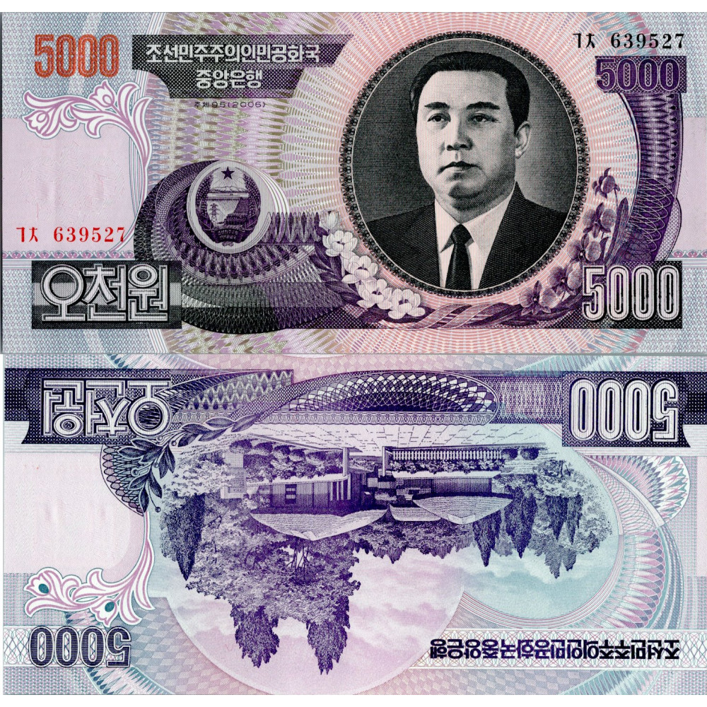 Bankovka KLDR, 2006, serie 7자, 5000 North Korean wo, Pi. 46c, N/UNC, Bankovka 5000 severokorejských wonů z roku 2006 s portrétem Kim Il-sunga na líci a stadionem May Day na rubu, emitována Centrální bankou KLDR., 5000 North Korean wo