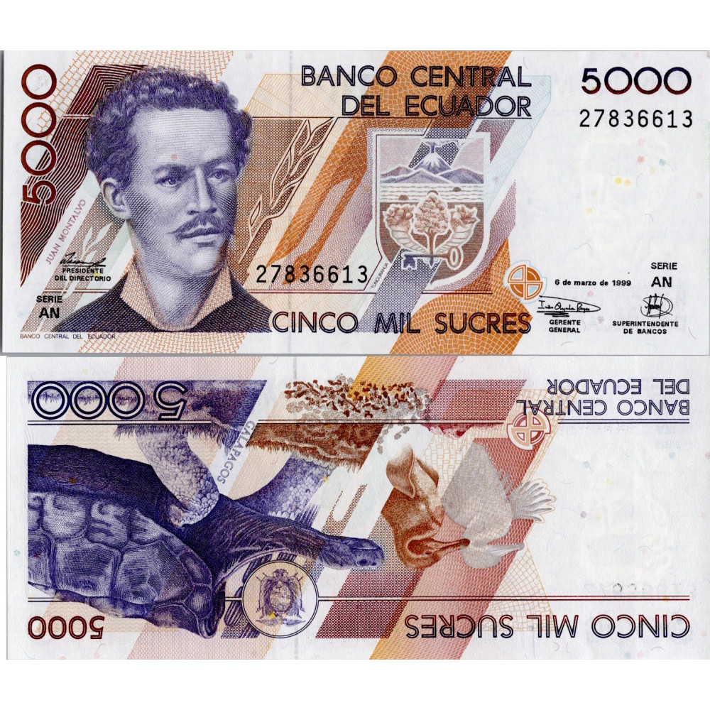 Bankovka Ekvádor, 1999, serie AN, 5000 Sucre, Pi. 128c.2, N/UNC, Bankovka 5000 ekvádorských suků vydaná Banco Central del Ecuador v roce 1999 s portrétem spisovatele Juana Montalva a státním znakem na lícové straně a galapážskou faunou – obrovskou želvou a modroočkaou sule na rubu., 5000 Sucre