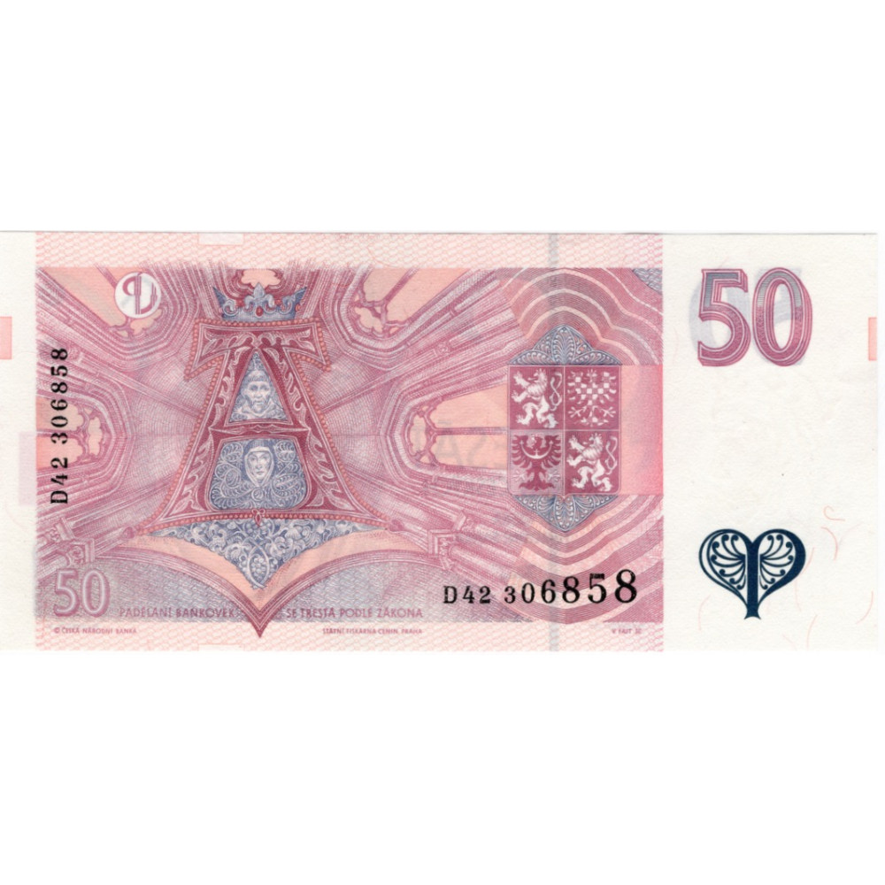 Bankovka ČR, 50 Kč, Pi. 17b, 0/AU, serie D, vzor 1997, Česká bankovka 50 korun zobrazující gotické klenby chrámu sv. Barbory v Kutné Hoře v růžovo-červených odstínech., 50 Kč