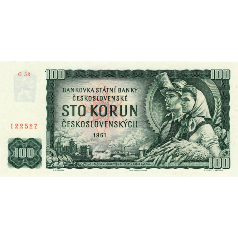 Bankovka ČSR, 100 Kčs, Pi. 91c, , 1961, serie G, 58, Bankovka 100 korun československých z roku 1961 se zobrazením horníka a zemědělky, průmyslových a zemědělských motivů., 100 Kčs