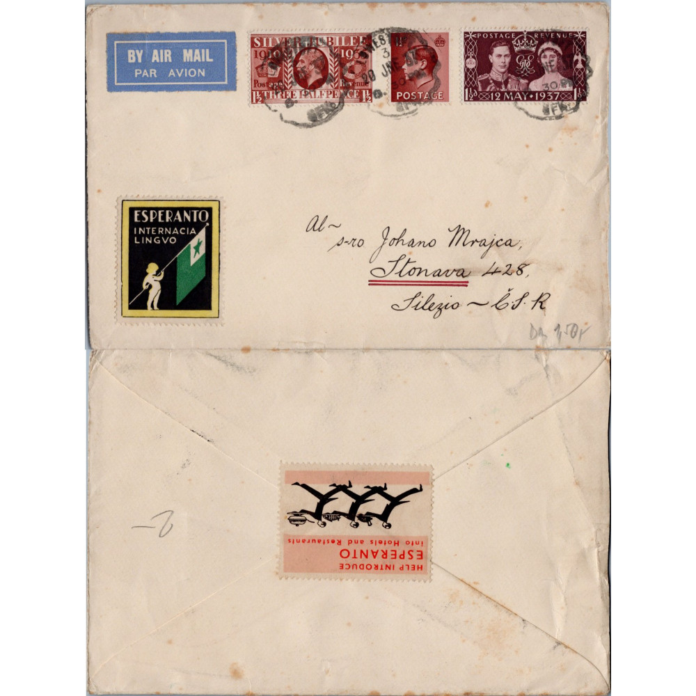 | Cover Great Britain, Used #, United Kingdom, 1938 airmail envelope from London to Stonava, Czechoslovakia, franked with British commemorative stamps and adorned with Esperanto labels.CatalogUsed stamp/item. | |
