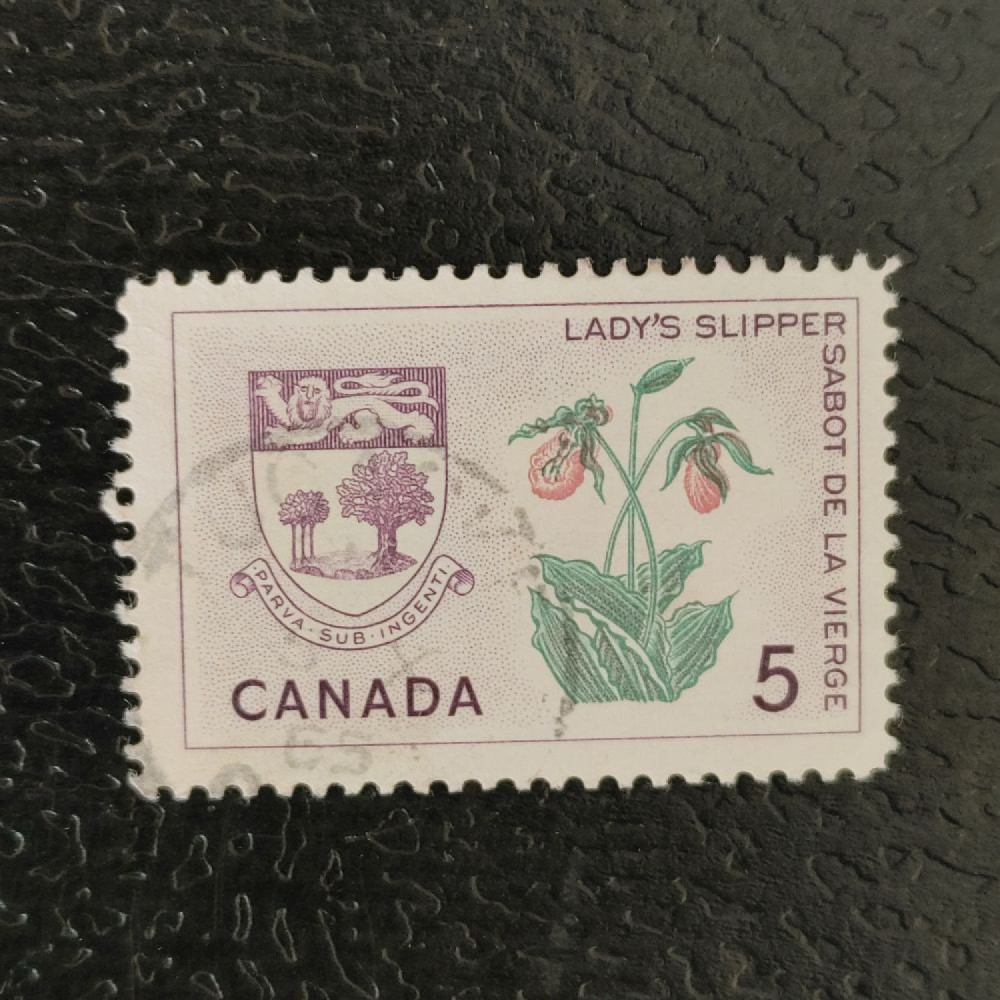 Stamp Canada, Mi.368 (SG 549), Used #, 1965 Provincial Emblems Lady's Slipper and Arms of Prince Edward IslandCatalogMichel368Stanley Gibbons549424Yvert349Used stamp/item.