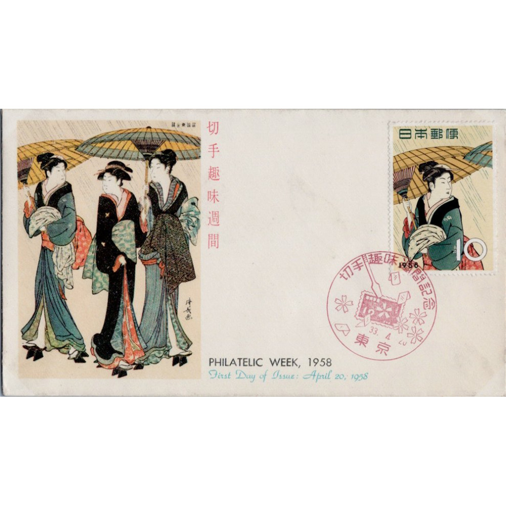 Položka:FDC Japonsko, Mi.678 (SG 776)**, 10 ¥, 1958 - Filatelistický týden – japonské umění, Detail of "Three Women in the Rain" by Torii Kiyonaga, 1783, 10 ¥KatalogMichel678Stanley Gibbons776646Yvert601Nepoužitá, neražená, čistá známka/položka.