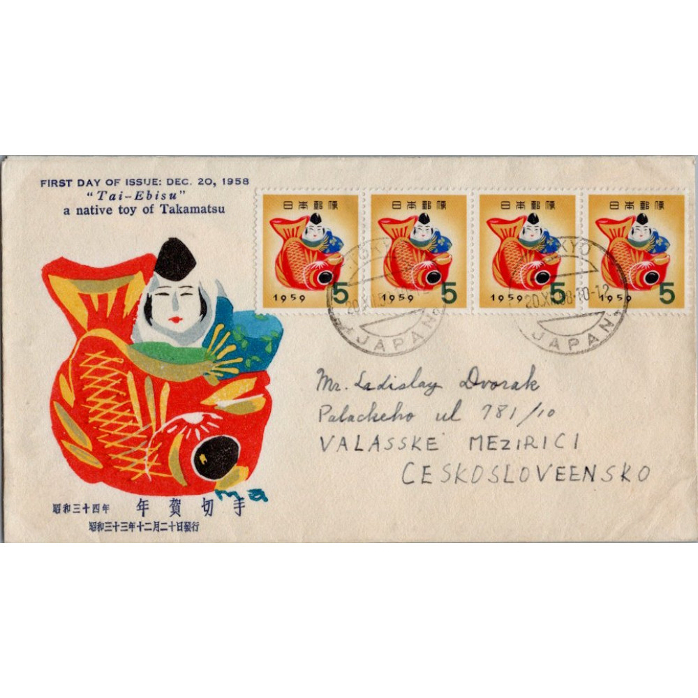 FDC Japonsko, Mi.694 (SG 792)#, 5 ¥, 1958 - Novoroční pozdravy, Ebisu s Tai (mořský cejn) – lidové hračky z Takamatsu, 5 ¥