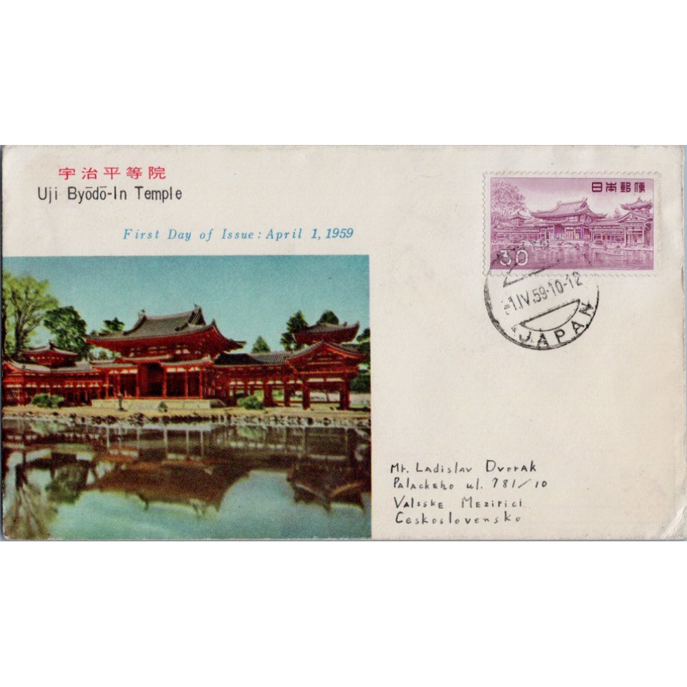 Tagy: FDC Japonsko, Mi.699, SG 663, 30 ¥, 1959, Fauna, flóra a národní poklady, Síň Fénix, chrám Byōdō-in, Uji, prefektura Kjóto, náboženství, architektura, chrámy, budovy, UNESCO památky, Architecture