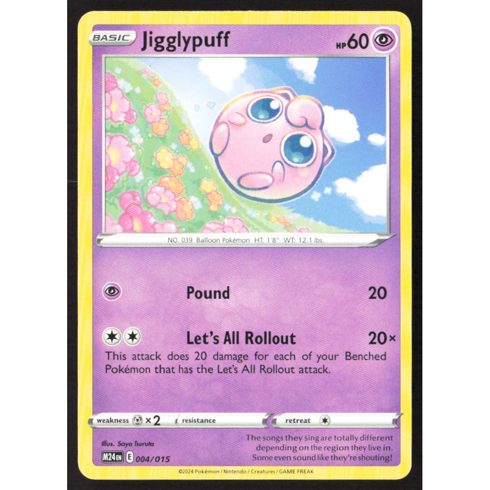 Pokémon karta, M24E 004/015, Použ., Jigglypuff, HP 60, Jigglypuff Basic psychická Pokémon karta s 60 HP z propagační edice 2024. Obsahuje útoky Pound a Let’s All Rollout, ilustrace od Saya Tsuruta. Vhodná pro sběratele i hraní.