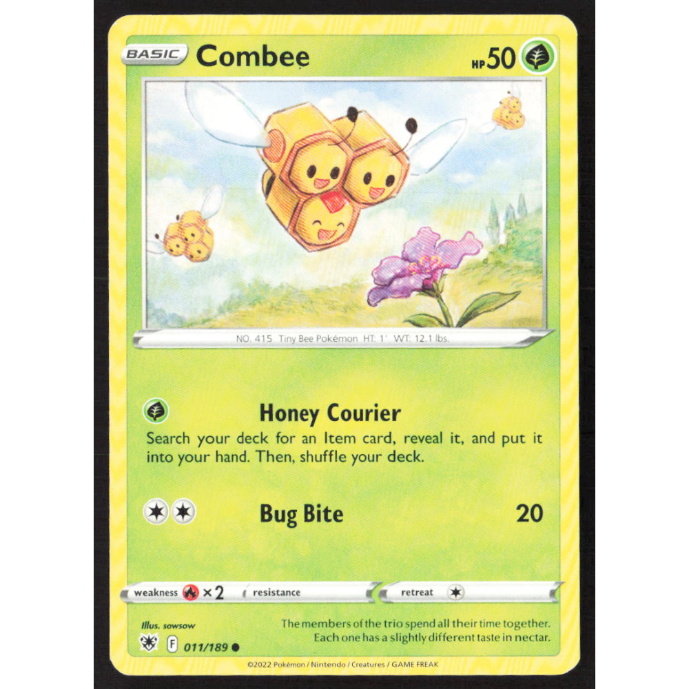Pokémon karta, 011/189, Použ., Combee, HP 50, Combee je základní karta Grass typu z rozšíření Paldea Evolved s 50 HP a dvěma útoky. Honey Courier vám umožní vyhledat kartu Item v balíčku a přidat ji do ruky, zatímco Bug Bite způsobí 20 poškození. Karta má slabinu Fire ×2 a ústupovou cenu 1 Colorless energie. Scarlet & Violet.