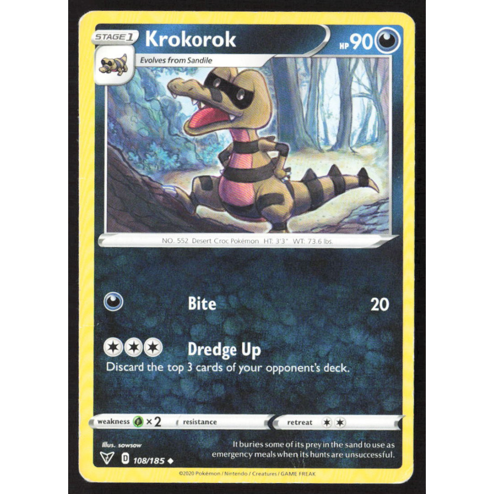 Pokémon karta, 108/185, Použ., Krokorok, HP 90, Krokorok je Pokémon karty typu Temnota ve fázi 1 ze sady Vivid Voltage s 90 HP. Disponuje útokem Zub, který způsobí 20 poškození, a Vykopáváním nahoru, které odhodí tři vrchní karty balíčku soupeře, což skvěle narušuje jeho strategii. Sword & Shield.
