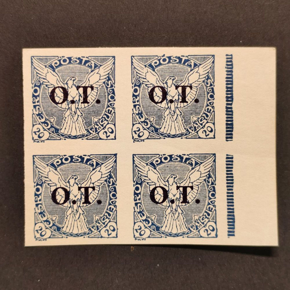 | Položka: | Čtyřblok ČSR, Pof.OT2**, 20h známky pro obchodní tiskoviny (O.T.), 20hKatalogMichel327PofisOT2Nepoužitá, neražená, čistá známka/položka. |