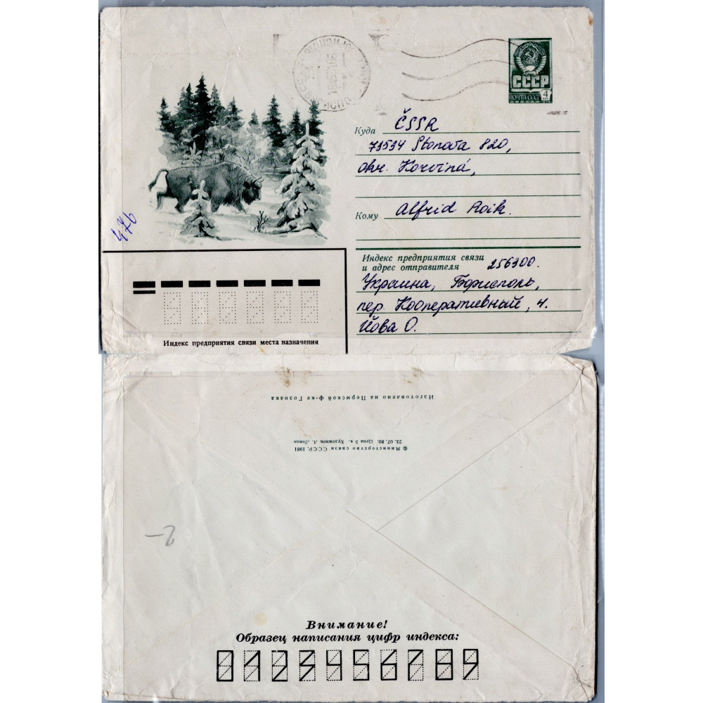 | Položka: | Celistvost Rusko#, Sovětský svaz, Sovětská celistvost s potiskem evropského zubra a tištěnou známkou 4 kopějky, odeslaná z Ukrajiny do Československa.KatalogRazítkovaná, použitá známka/položka. |