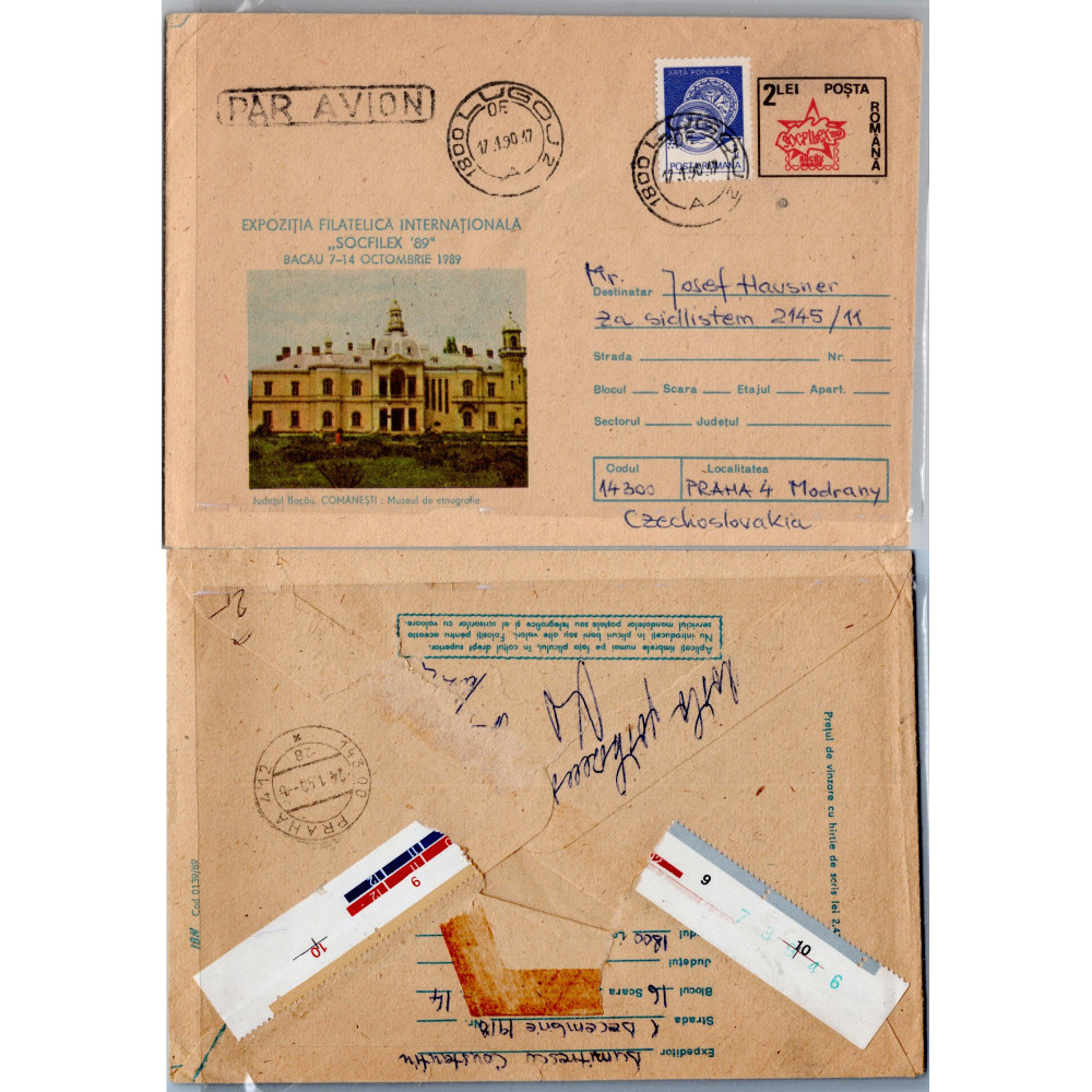 Celistvost Rumunsko#, Rumunská filatelistická obálka vydaná k mezinárodní výstavě SOFICLEX '89 v Bacău, letecky do Československa.